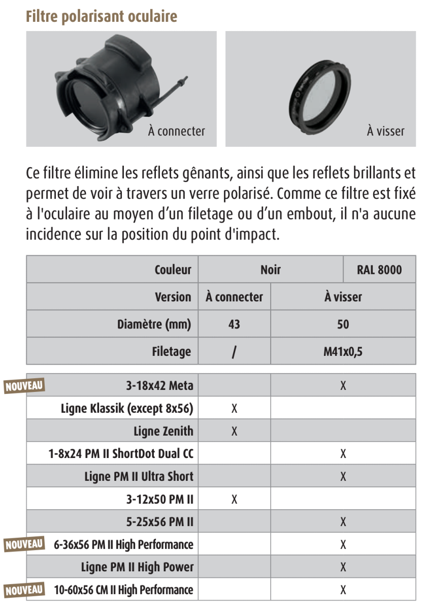 - Compatibilité : Ligne Klassik (sauf 8x56), Ligne Zenith, 3-12x50 PM II